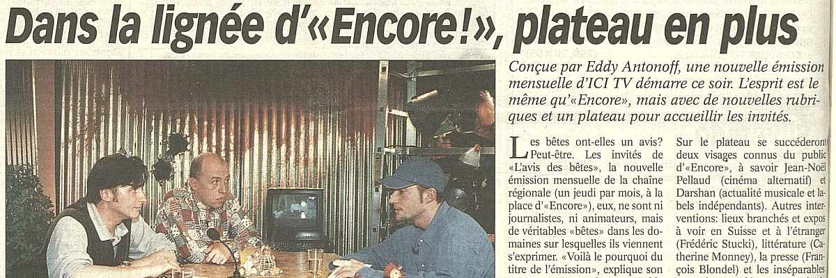 Conçue par Eddy Antonoff, une nouvelle émission mensuelle d’ICl TV démarre ce soir. L’esprit est le même qu’«Encore», mais avec de nouvelles rubriques et un plateau pour accueillir les invités. Les bêtes ont-elles un avis? Peut-être. Les invités de «L’avis des bêtes», la nouvelle émission mensuelle de la chaîne régionale [...suite]