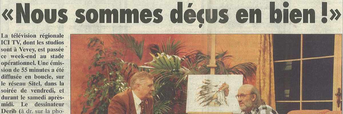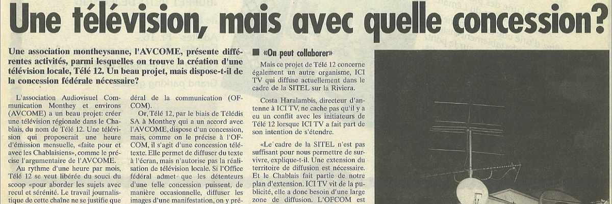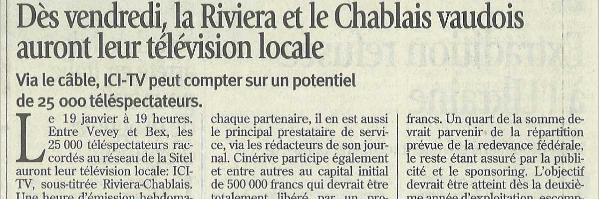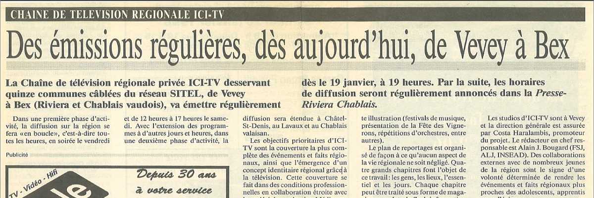 Tous les vendredis à 19 h, si vous êtes dans la région veveysanne, branchez votre téléviseur sur l'ancien canal de service du téléréseau de la SITEL. Vous pourrez alors assister à la première diffusion de l'émission hebdomadaire... [...suite]