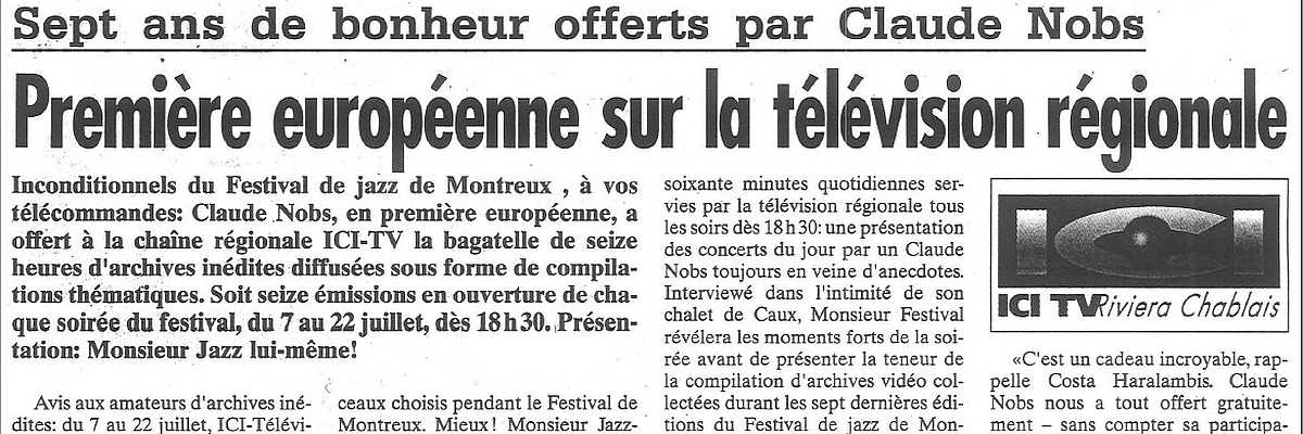 Inconditionnels du Festival de jazz de Montreux , à vos télécommandes: Claude Nobs, en première européenne, à la chaîne régionale ICI-TV la bagatelle de seize heures d'archives inédites diffusées sous forme de compilations thématiques. Soit seize émissions en ouverture de chaque soirée du festival, du 7 au 22 juillet, dès 18h30. Présentation: Monsieur Jazz lui-même! [...suite]