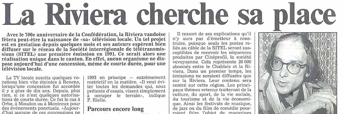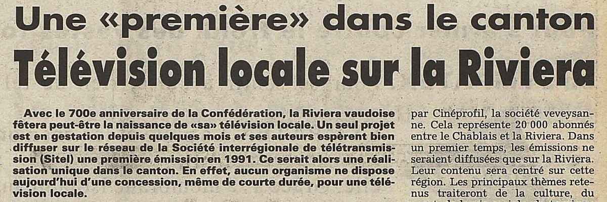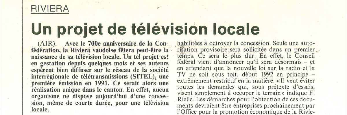 Avec le 700e anniversaire de la Confédération, la Riviera vaudoise fêtera peut-être la naissance de «sa» télévision locale. Un seul projet est en gestation depuis quelques mois et ses auteurs espèrent bien diffuser sur le réseau de la Société interrégionale de télétransmission (Sitel) une première émission en 1991. Ce serait alors une réalisation unique dans le canton. [...suite]