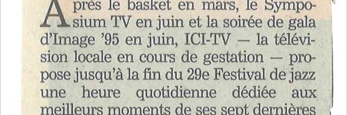 Après le bas­ket en mars, le Symposium TV en juin et la soi­rée de gala d’Image ’95 en juin, ICI-TV – la télé­vi­sion locale en cours de ges­ta­tion ‑pro­pose jus­qu’à la fin du 29e Festival de jazz une heure quo­ti­dienne dédiée aux meilleurs moments de ses sept der­nières édi­tions. Un cadeau de seize heures d’en­re­gis­tre­ments inédits offertes par Monsieur fes­ti­val him­self, qui se fend de sur­croît d’une brève pré­sen­ta­tion des soi­rées 1995, ain­si que de plu­sieurs anec­dotes cueillies au fil des émis­sions et en fonc­tion de l’ac­tua­li­té musi­cale du jour.